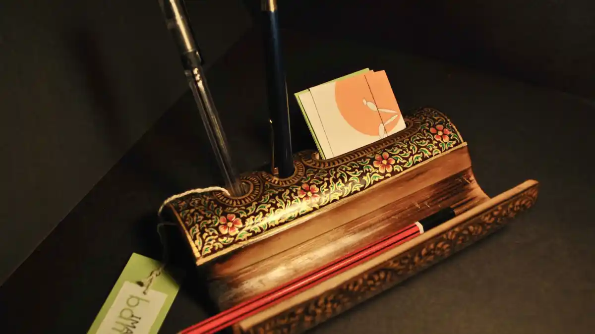 Sculpted from bamboo, this pen stand showcases the versatility and beauty of the material. Inspired by a classroom project, it combines traditional Rajasthani artwork with modern design to create a unique and functional piece. Akshay Khandelwal