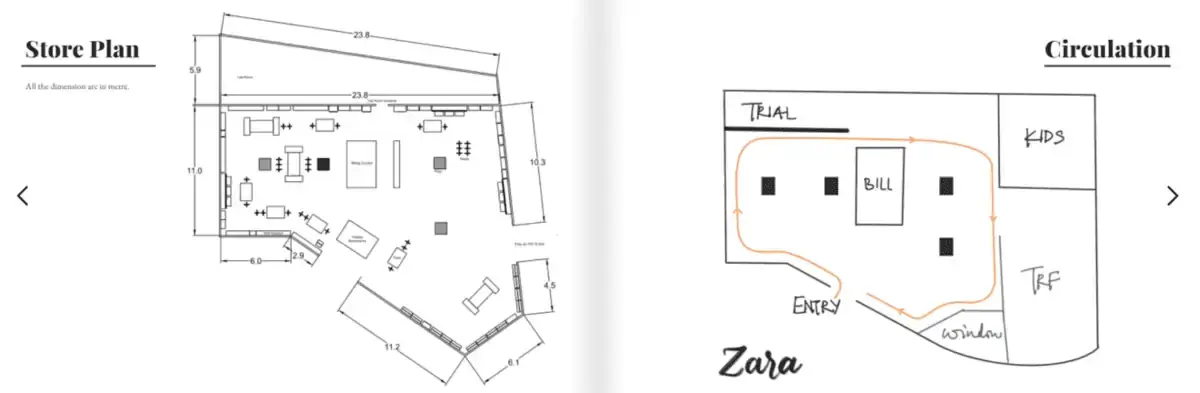 Floor layout decides customer navigation inside the store. Some layout options include loop, angular, grid, forced path, free-flowing, etc. Choose the design that suits your needs.