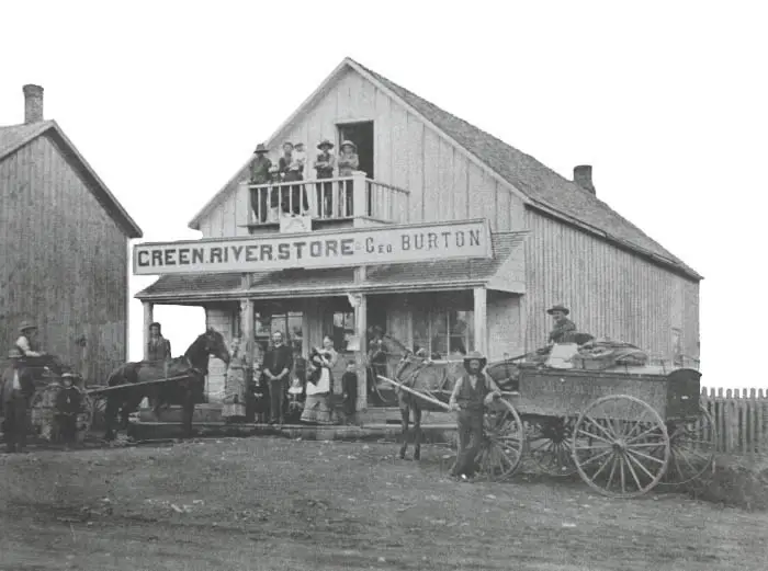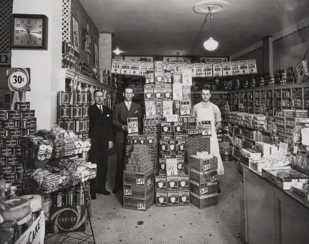 The highest forms of visual merchandising were signage boards with large typefaces and storefront displays of staked products on a table.